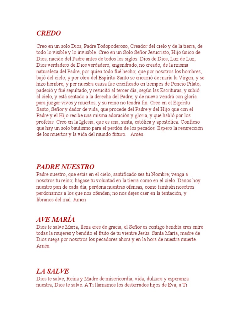 Credo Padre Nuestro Y Ave María / Como era en un principio, ahora y siempre, y por los siglos de los siglos. Credo Padre Nuestro Y Ave María - Dios te salve maria llena eres de gracias el senor esta contigo;
