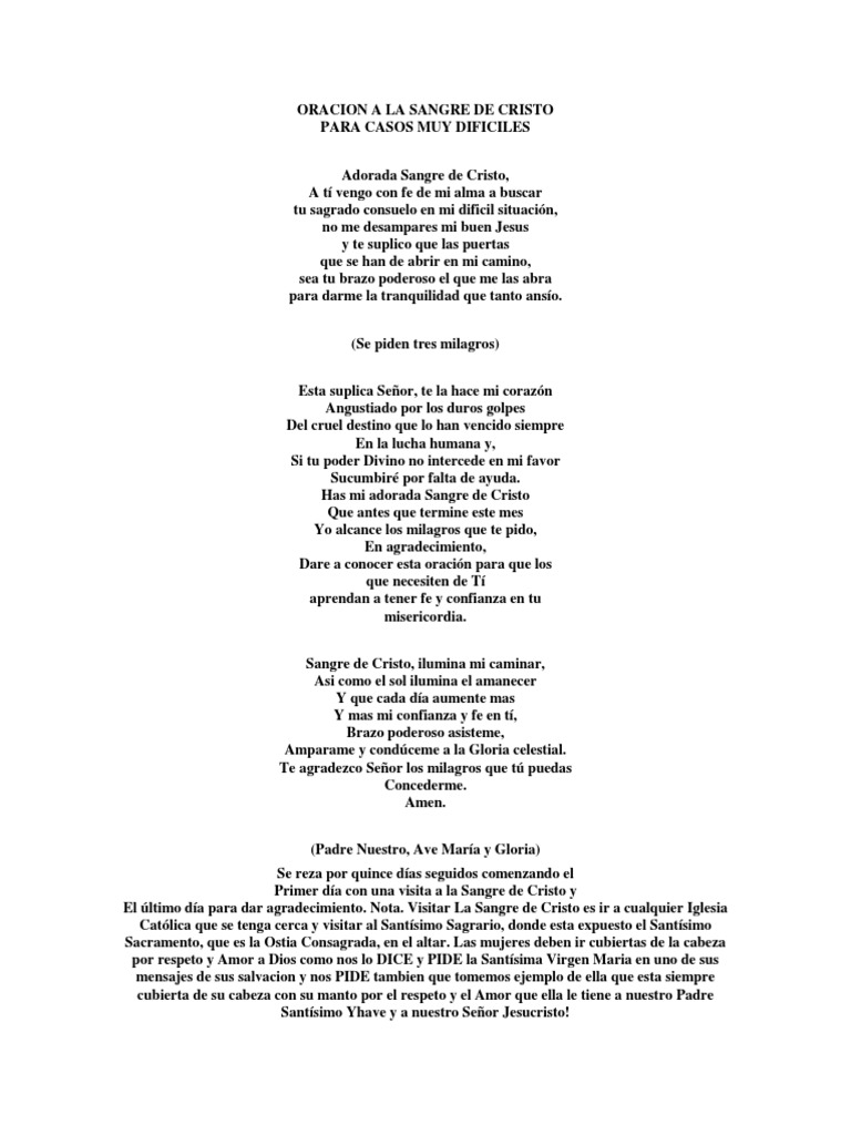 Oracion A La Sangre De Cristo Para Pedir Tres Milagros En Casos Dificiles - Sangre santa, sangre pura, dulce y divina, te adoro preciosa sangre y te bendigo;