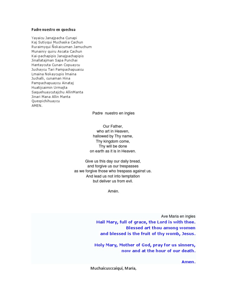Padre Nuestro En Quechua Worship Prayer - Ave maria en todos los idiomas.